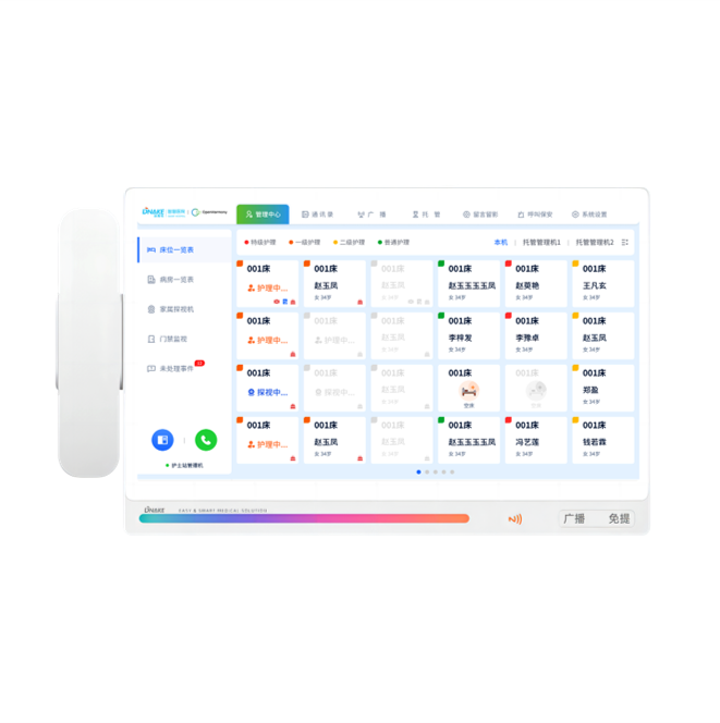 創(chuàng)新設置在護士站,可壁掛也可直接放在桌面上。主要接聽病區(qū)內病床分機的呼叫以及患者信息查詢、廣播等基礎應用功能,減輕醫(yī)護人員來回跑動的無效勞動和壓力,及時響應患者需求,并做好醫(yī)護信息管理。軟件參數:1)采用多點觸控電容顯示屏操作。每個觸摸按鈕可以顯示整個病區(qū)下的,所有病人的名字、性別、護理等級,點擊格子后,可顯示每張病床患者更具體的患者信息。2)基于TCP/IP網