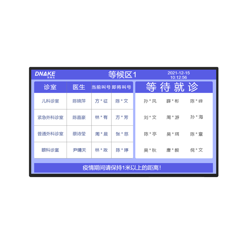安裝在門診等候大廳,用于隨時得知患者等候科室的叫號順序,便于患者提前準(zhǔn)備前往科室,緩解患者在等候過程中的焦慮情緒。